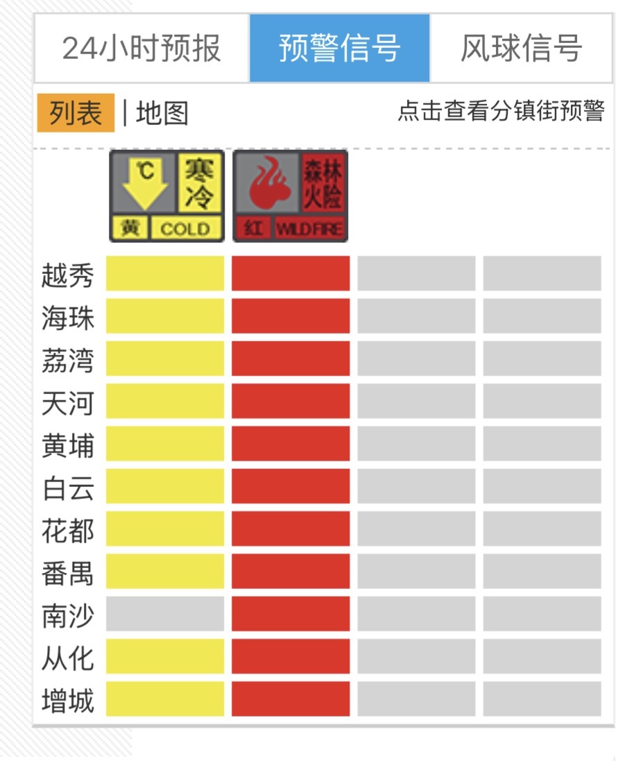 据@广州天气,目前冷空气主体已达粤北,今天白天冷空气渗透影响,广州云量逐渐增多,白天最高温较昨日下降(19℃左右)。截至11:30,除南沙外,广州10区寒冷黄色预警生效。
